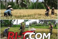 RI-1.com — Badung, Babinsa Desa Pangsan, Peltu Dewa Gede Sena Alam, dalam rangka membantu petani panen padi di Subak Bergiding, Desa Pangsan,