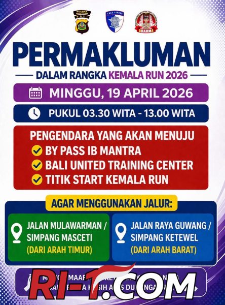 Bali – RI-1.COM, Dalam rangka mendukung kelancaran Kemala Run tanggal 19 April 2026 , Polda Bali melalui Kabid Humas Kombes Pol Ariasandy S.I.K., resmi mengumumkan permakluman terkait penutupan dan pengalihan arus lalu lintas di kawasan Jl. By Pass Ida Bagus Mantra Gianyar, kamis 9/4/2026.
