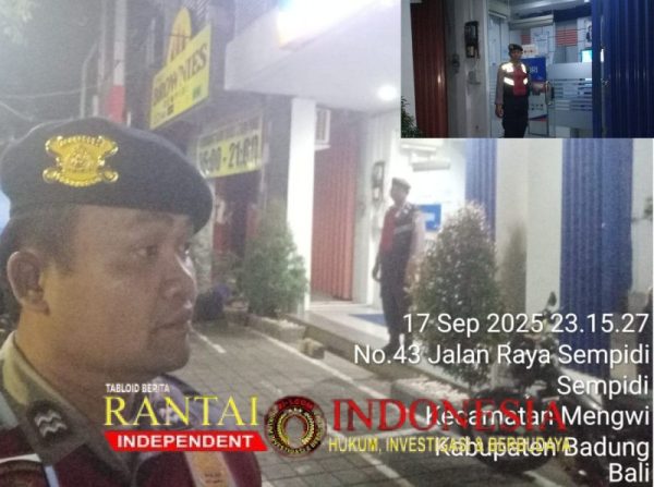 Mengwi – RI-1.com,   Untuk menjaga situasi kamtibmas tetap aman dan kondusif, personil Polsek Mengwi melaksanakan patroli malam hari dengan menyambangi sejumlah objek vital, salah satunya Kantor BRI Unit Sempidi, yang berlokasi di Jalan Raya Sempidi, Kelurahan Sempidi, Kecamatan Mengwi, Kabupaten Badung. Rabu (17/9/2025) pukul 23.15 wita