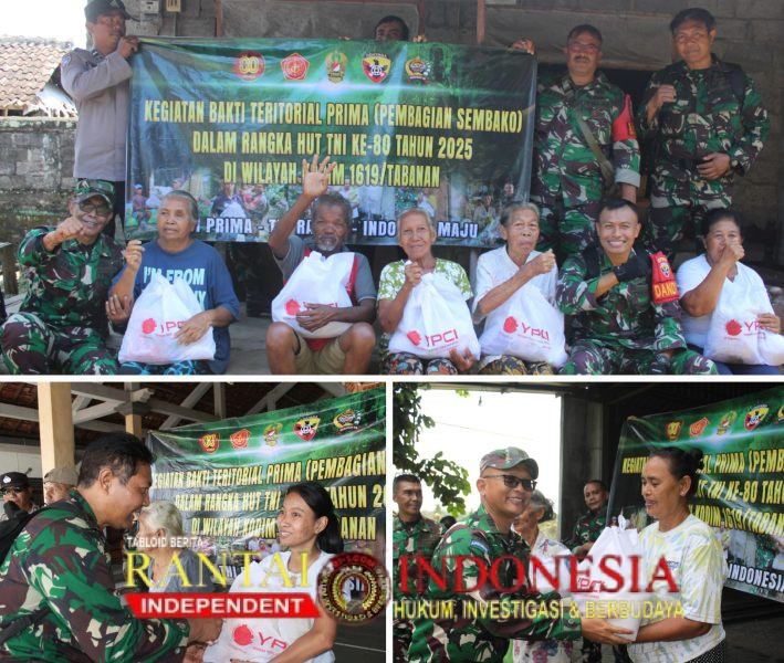 Tabanan – RI-1.com, Guna memperkuat hubungan dan kepedulian terhadap masyarakat, khususnya dalam meringankan beban hidup di masa yang menantang, Kodim 1619/Tabanan menggelar kegiatan Bakti Teritorial Prima dalam rangka HUT TNI ke-80 dengan membagikan paket sembako yang dipimpin langsung oleh Dandim Letkol Inf Trijuang Danarjati, S.A.P., M.I.P. Kegiatan ini menyasar warga kurang mampu yang tersebar di beberapa titik di wilayah Kabupaten Tabanan, Kamis (25/9/2025).