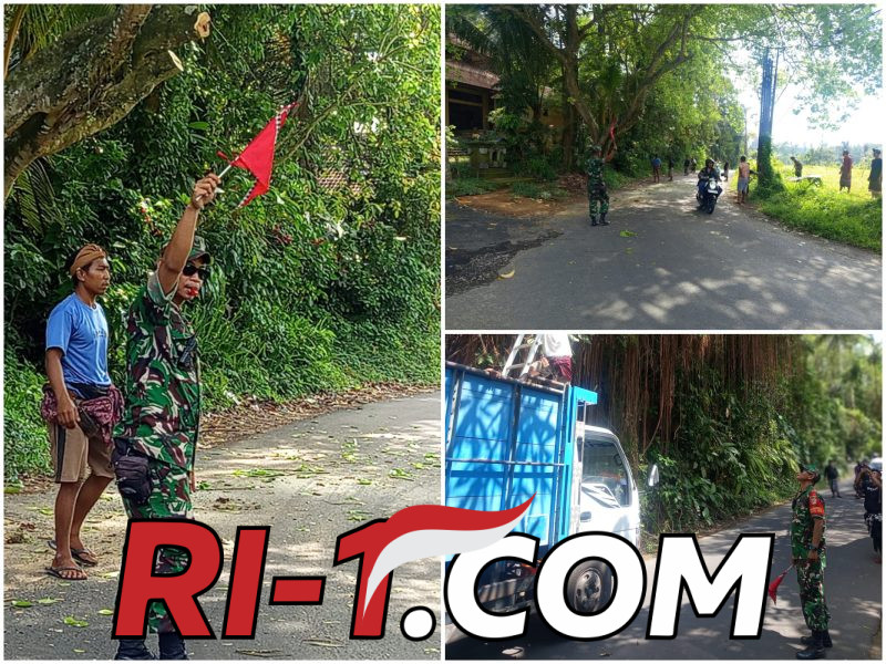 RI-1.com — Tegallalang, Sabtu (18/10/2025) Dalam rangka menjaga keamanan dan kenyamanan masyarakat, Babinsa Desa Keliki Koramil 1616-06/Tegallalang Sertu Dewa Made Sudiarta bersama Pecalang Desa Adat Keliki melaksanakan kegiatan pengamanan serta pengaturan arus lalu lintas pada kegiatan pemotongan dan pembersihan dahan serta ranting pohon di sepanjang jalan raya Desa Keliki menuju Desa Kedewatan, Kecamatan Ubud, Kabupaten Gianyar.