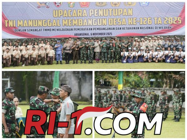 RI-1.com — Badung, Dalam rangka Upacara Penutupan Tentara Manunggal Membangun Desa (TMMD) Ke-126 TA 2025 Kodim 1611/Badung, dalam Mewujudkan Pemerataan Pembangunan dan Ketahanan Nasional di Wilayah, pelaksanaan upacara penutupan dilaksanakan di Lapangan Sepak Bola Desa Taman, Kecamatan Abiansemal, Kabupaten Badung. Selaku Inspektur Upacara Danrem 163/WSA Brigjen TNI Ida I Dewa Agung Hadisaputra, dan selaku Komandan Upacara Pjs Danramil 1611-03/Kuta Mayor Inf Hendra Gunawan. Kamis, (06/11/25).